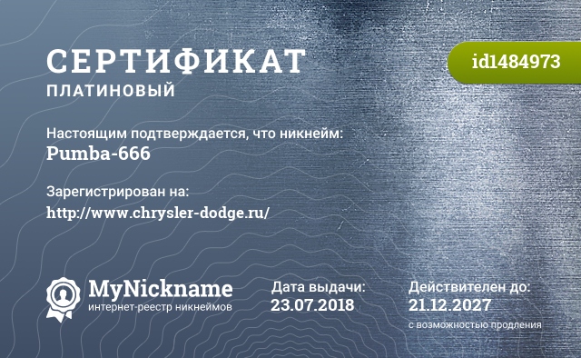 Nickname Pumba-666 is registered to http://www.chrysler-dodge.ru/. Issued certificate ID1484973. Issue date 23.07.2018.