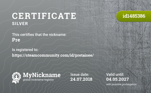 Nickname Pre is registered to https://steamcommunity.com/id/pretaisee/. Issued certificate ID1485386. Issue date 24.07.2018.