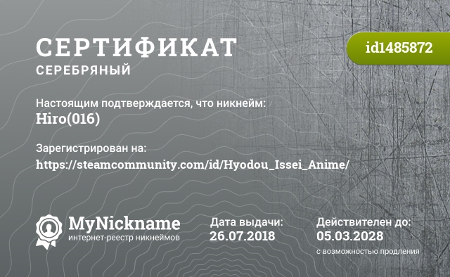 certificate for nickname: Hiro(016) (id1485872)