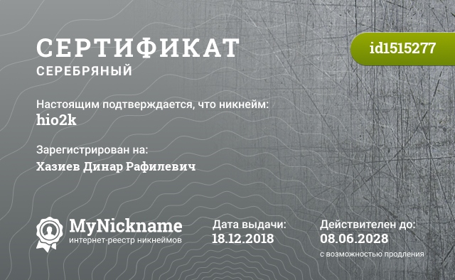 сертификат на никнейм hio2k (id1515277)