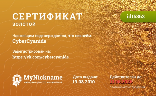 Nickname CyberCyanide is registered to https://vk.com/cybercyanide. Issued Gold certificate ID15362. Issue date 19.08.2010.