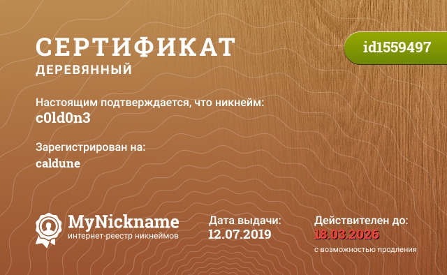 Nickname c0ld0n3 is registered to caldune. Issued certificate ID1559497. Issue date 12.07.2019.