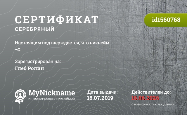 Никнейм -c зарегистрирован на Глеб Ролин. Выдан сертификат id1560768. Дата выдачи 18.07.2019.