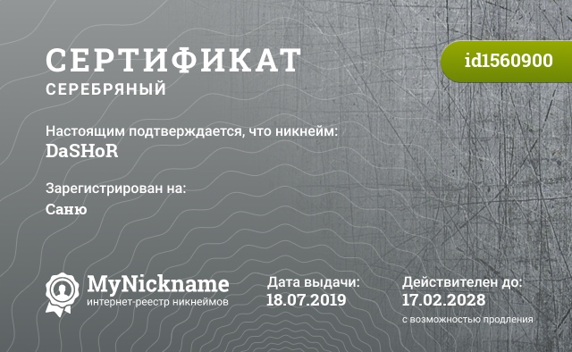 Nickname DaSHoR is registered to Sanya. Issued certificate ID1560900. Issue date 18.07.2019.