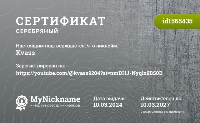 сертификат на никнейм Kvass (id1565435)