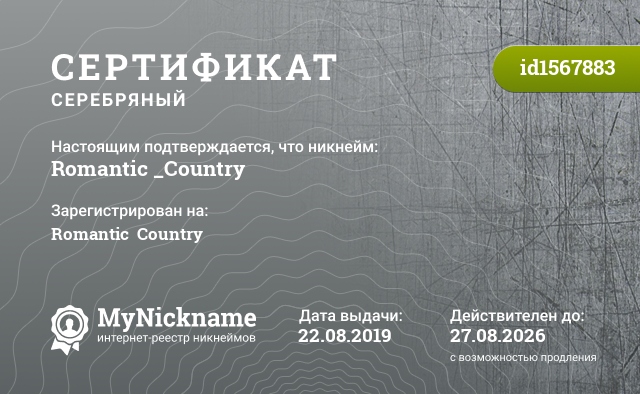 Nickname Romantic _Country is registered to Romantic Country. Issued certificate ID1567883. Issue date 22.08.2019.