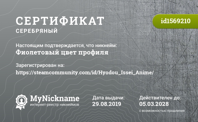 Nickname Фиолетовый цвет профиля is registered to https://steamcommunity.com/id/Hyodou_Issei_Anime/. Issued certificate ID1569210. Issue date 29.08.2019.