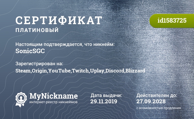 Никнейм SonicSGC зарегистрирован на Steam,Origin,YouTube,Twitch,Uplay,Discord,Blizzard. Выдан сертификат id1583725. Дата выдачи 29.11.2019.