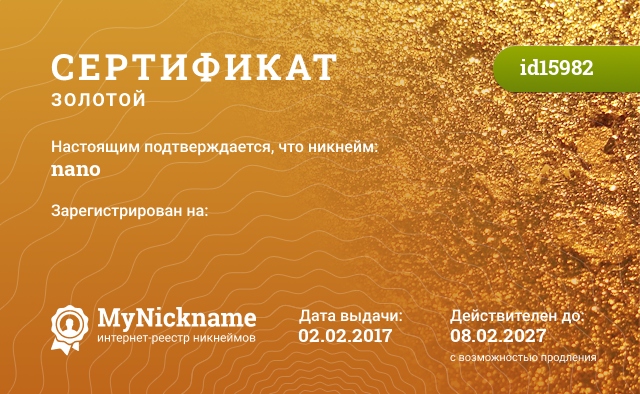 Никнейм nano зарегистрирован на سيرجي. Выдан сертификат id15982. Дата выдачи 02.02.2017.