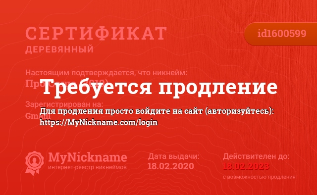 Сертификат на никнейм Про Саша (2019), зарегистрирован на Gmaill