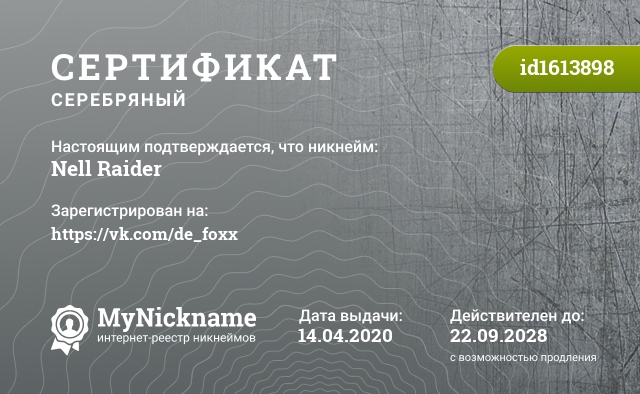 Nickname Nell Raider is registered to https://vk.com/de_foxx. Issued certificate ID1613898. Issue date 14.04.2020.