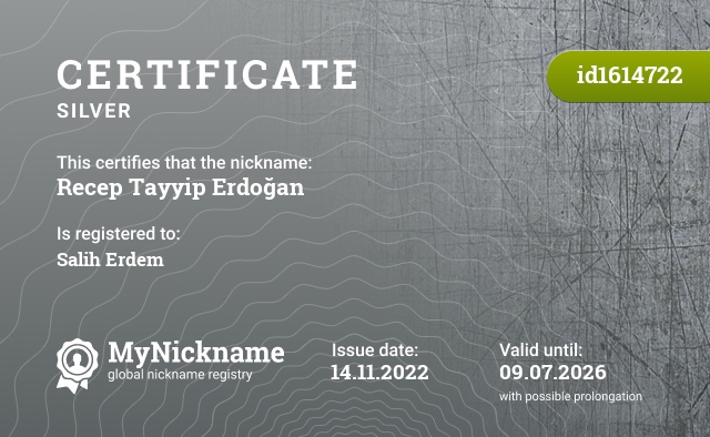 certificate for nickname: Recep Tayyip Erdoğan (id1614722)