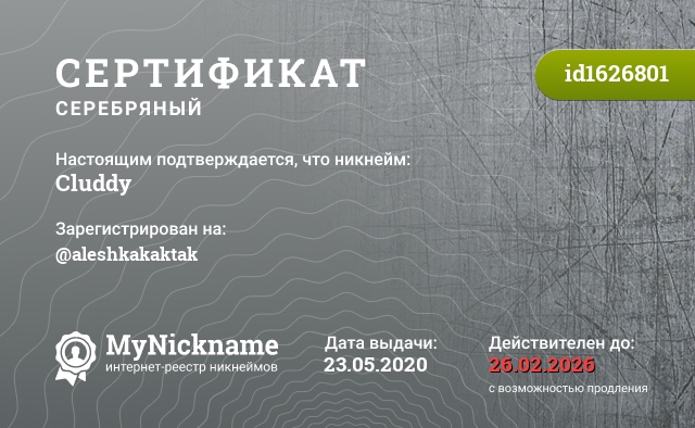 Никнейм Cluddy зарегистрирован на @aleshkakaktak. Выдан сертификат id1626801. Дата выдачи 23.05.2020.
