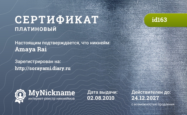 Nickname Amaya Rai is registered to http://sorayami.diary.ru. Issued certificate ID163. Issue date 02.08.2010.