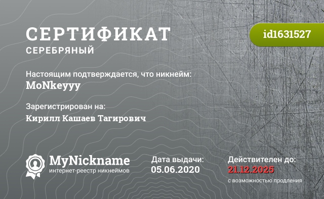 Nickname MoNkeyyy is registered to Kirill Kashaev Tagirovich. Issued certificate ID1631527. Issue date 05.06.2020.