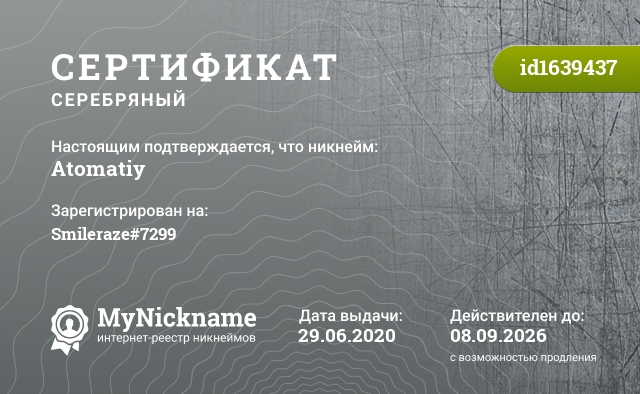 Nickname Atomatiy is registered to Smileraze#7299. Issued certificate ID1639437. Issue date 29.06.2020.