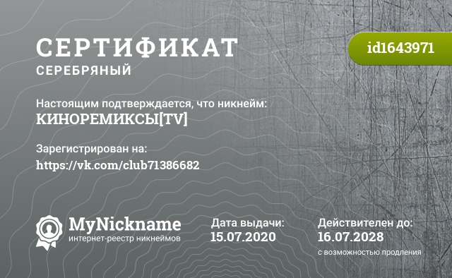 Nickname КИНОРЕМИКСЫ[TV] is registered to https://vk.com/club71386682. Issued Silver certificate ID1643971. Issue date 15.07.2020.