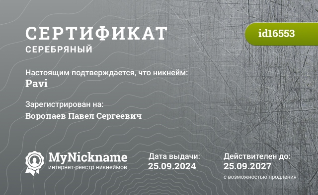 Никнейм Pavi зарегистрирован на Воропаев Павел Сергеевич. Выдан золотой сертификат id16553. Дата выдачи 25.09.2024.