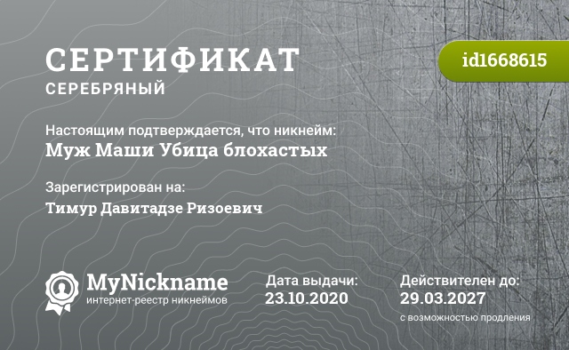 Nickname Муж Маши Убица блохастых is registered to Timur Davitadze Rizoevich. Issued certificate ID1668615. Issue date 23.10.2020.
