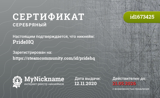 Nickname PrideHQ is registered to https://steamcommunity.com/id/pridehq. Issued Silver certificate ID1673425. Issue date 12.11.2020.