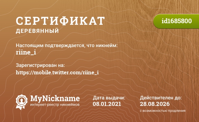 Nickname riine_i is registered to https://mobile.twitter.com/riine_i. Issued Wooden certificate ID1685800. Issue date 08.01.2021.