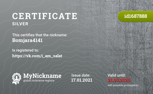 Nickname Bomjara4141 is registered to https://vk.com/i_am_salat. Issued certificate ID1687888. Issue date 17.01.2021.