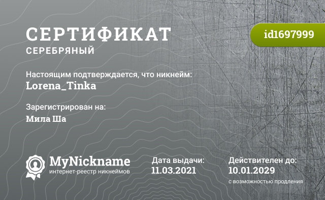 Nickname Lorena_Tinka is registered to Mila Sha. Issued certificate ID1697999. Issue date 11.03.2021.