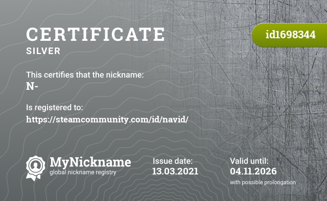 Nickname N- is registered to https://steamcommunity.com/id/navid/. Issued certificate ID1698344. Issue date 13.03.2021.
