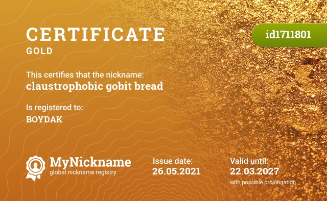 certificate for nickname: claustrophobic gobit bread (id1711801)