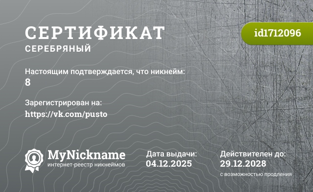 Nickname 8 is registered to https://vk.com/pusto. Issued certificate ID1712096. Issue date 04.12.2025.