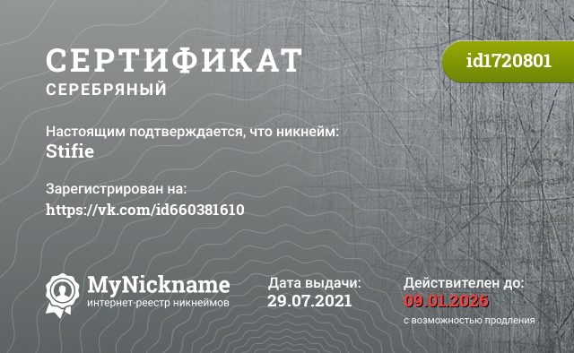Nickname Stifie is registered to https://vk.com/id660381610. Issued certificate ID1720801. Issue date 29.07.2021.
