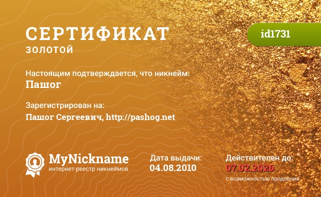 Nickname Пашог is registered to Pashog Sergeevich, http://pashog.net. Issued Gold certificate ID1731. Issue date 04.08.2010.