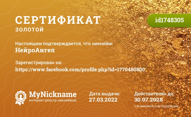 Gold ? certificate for nickname: НейроАнгел (id1748305)