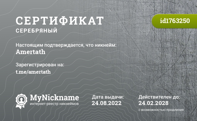 Nickname Amertath is registered to t.me/amertath. Issued certificate ID1763250. Issue date 24.08.2022.