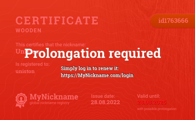 Никнейм Uniston зарегистрирован на uniston. Выдан сертификат id1763666. Дата выдачи 28.08.2022.