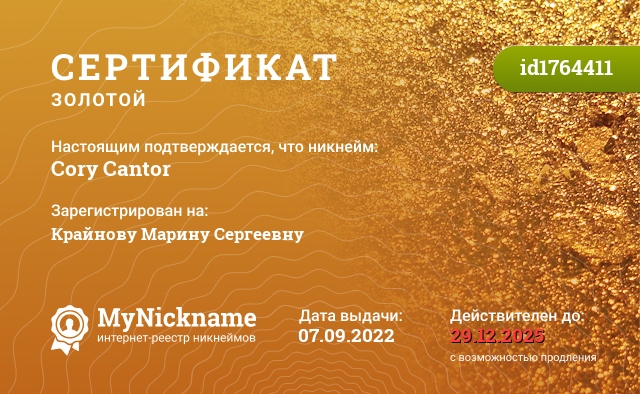 certificate for nickname: Cory Cantor (id1764411)