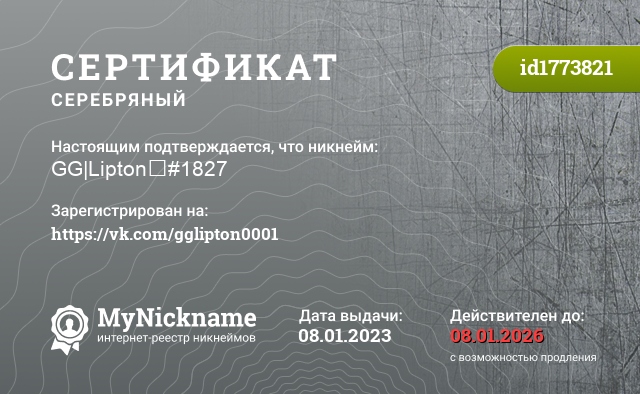 Nickname GG|Lipton✨#1827 is registered to https://vk.com/gglipton0001. Issued Silver certificate ID1773821. Issue date 08.01.2023.