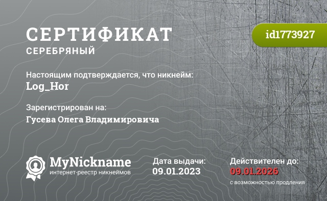 сертификат на никнейм Log_Hor (id1773927)