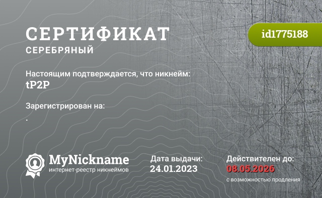 Никнейм tP2P зарегистрирован на .. Выдан сертификат id1775188. Дата выдачи 24.01.2023.