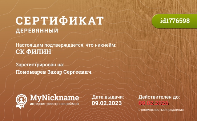 Nickname СК ФИЛИН is registered to Ponomarev Zakhar Sergeevich. Issued certificate ID1776598. Issue date 09.02.2023.