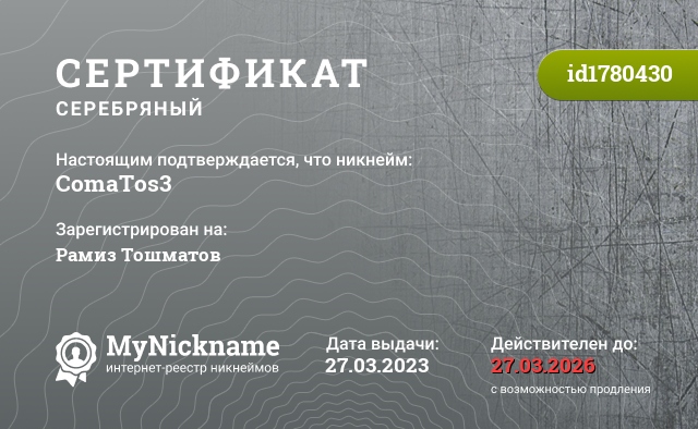 Nickname ComaTos3 is registered to Ramiz Toshmatov. Issued certificate ID1780430. Issue date 27.03.2023.