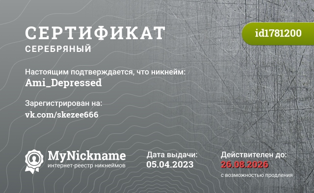 Nickname Ami_Depressed is registered to vk.com/skezee666. Issued certificate ID1781200. Issue date 05.04.2023.
