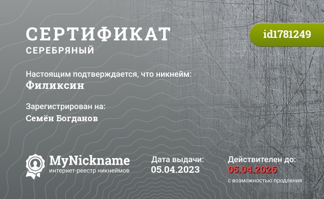 Nickname Филиксин is registered to Semyon Bogdanov. Issued Silver certificate ID1781249. Issue date 05.04.2023.