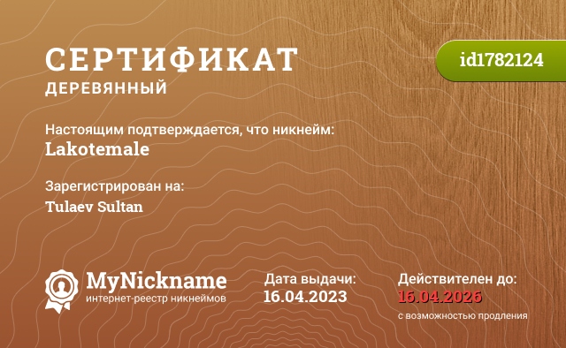 Nickname Lakotemale is registered to Tulaev Sultan. Issued certificate ID1782124. Issue date 16.04.2023.