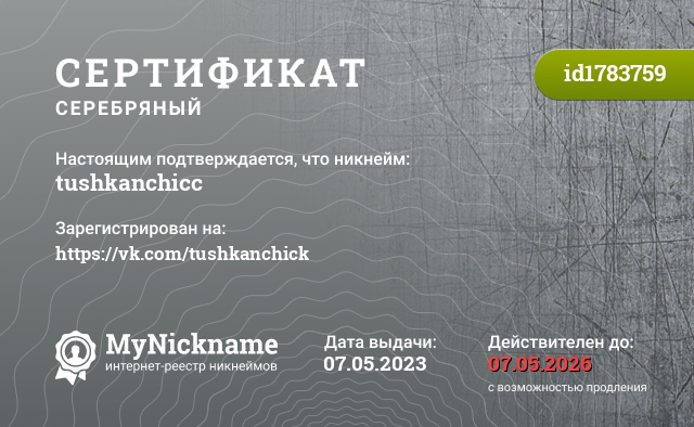 Никнейм tushkanchicc зарегистрирован на https://vk.com/tushkanchick. Выдан сертификат id1783759. Дата выдачи 07.05.2023.