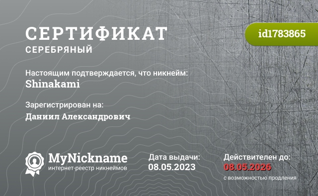 сертификат на никнейм Shinakami (id1783865)