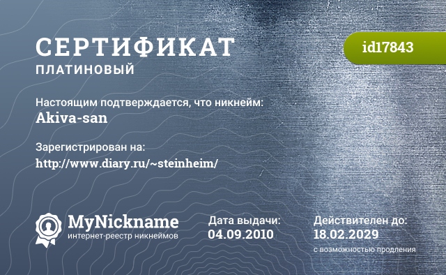 Nickname Akiva-san is registered to http://www.diary.ru/~steinheim/. Issued certificate ID17843. Issue date 04.09.2010.
