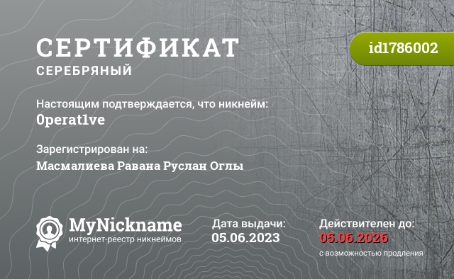 Silver ? certificate for nickname: 0perat1ve (id1786002)