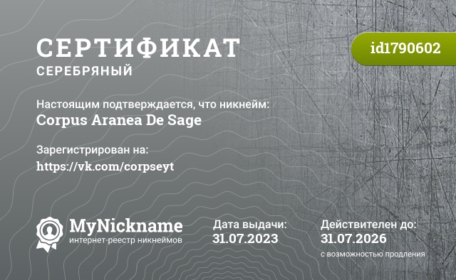 сертификат на никнейм Corpus Aranea De Sage (id1790602)
