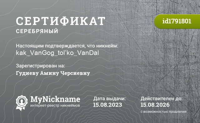 Nickname kak_VanGog_tol’ko_VanDal is registered to Gudieva Amin Chersievna. Issued certificate ID1791801. Issue date 15.08.2023.